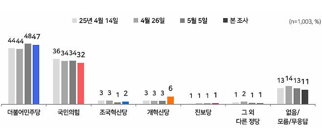 정당 지지도에선 더불어민주당이 47%, 국민의힘 32%, 조국혁신당 2%, 개혁신당 6%, 진보당 1% 순이었고, 직전 조사와 비교하면 민주당과 국민의힘이 각각 1%포인트, 2%포인트 하락한 반면, 개혁신당이 3%포인트 상승했습니다.