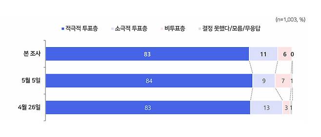 응답자의 83%는 '대선에 반드시 투표하겠다', 11%는 '가능하면 투표하겠다'고 답했으며, 지지하는 후보별로는 이재명 지지층에선 93%가, 김문수 지지층에선 88%가 '반드시 투표하겠다'고 답했습니다.