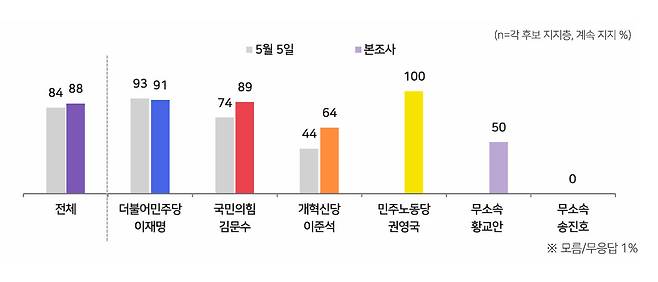 또, 88%의 응답자는 '지금 지지하고 있는 후보를 계속 지지하겠다'고 답했는데, 후보별로는 이재명 후보 지지층은 91%, 김문수 후보 지지층은 89%, 이준석 후보 지지층은 64%가 '계속 지지하겠다'는 뜻을 밝혔습니다.