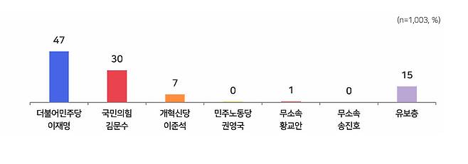 '코리아리서치'가 MBC의 의뢰로 지난 14일과 15일 전국 18세 이상 성인 남녀 1,003명을 대상으로 조사한 결과, 이재명 후보 지지도는 47%로, 김문수 후보 30%, 이준석 후보 7%를 크게 앞서는 것으로 나타났습니다.