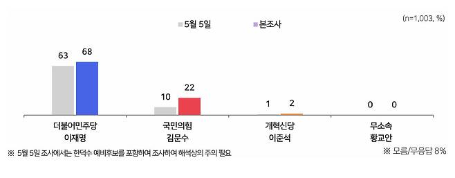 ●조사의뢰 : MBC ●조사기관 : (주)코리아리서치인터내셔널 ●조사지역 : 전국 ●조사기간 : 2025년 5월 14일~15일 (2일간) ●조사대상 : 전국 만 18세 이상 ●조사방법 : 통신 3사 휴대전화 가상(안심)번호 전화면접 ●피조사자 선정방법 : 성·연령·지역별 할당 ●응답률 : 25.7% (3,904명 중 1,003명) ●가중치값 산출 및 적용방법 : 성·연령·지역별 가중값 부여(셀가중, 2025년 4월 말 행안부 인구통계 기준) ●표본오차 : 95% 신뢰 수준 ±3.1% 포인트 ●질문내용 : 중앙선거여론조사심의위원회 홈페이지 참조