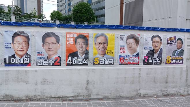 | ▲ 16일 아침 울산 남구 옥동 한 공동주택 담벼락에 붙은 21대 대선 후보자 선거 벽보 |