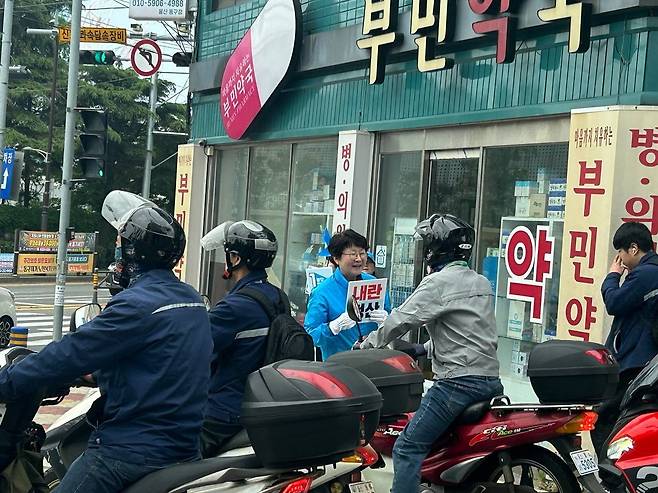 | ▲ 진보당 이은주 전 울산시의원이 16일 울산 동구 현대중공업 주변에서 출근하느 ㄴ노동자들에게 인사하고 있다 |