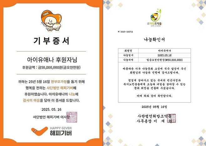 16일 아이유는 개인 계정에 기부 증서를 게시하며 "사랑의 기쁨으로 물드는 5월이 되길"이라고 덧붙였다.