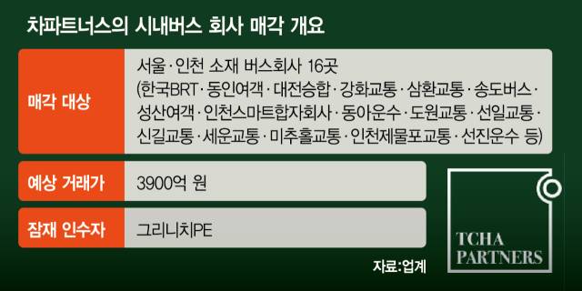 그리니치PE는 인수하려는 대상은 차파트너스가 4개 펀드를 통해 보유 중인 버스회사 16곳이다. 차파트너스는 ‘퍼블릭모빌리티 1호 PEF’를 통해 한국BRT·명진교통·동인여객·대전승합을, ‘퍼블릭모빌리티 2호 PEF’를 통해 강화교통·삼환교통·송도버스·성산여객·인천스마트합자회사를, ‘퍼블릭모빌리티 3호 PEF’를 통해 동아운수를, ‘ESG퍼블릭모빌리티 PEF’를 통해 도원교통·선일교통·신길교통·세운교통 등을 인수했다. 서울, 인천 등 수도권에 위치한 이들 버스회사가 보유한 시내버스는 총 2000대에 이른다. 이중 명진교통은 차파트너스가 지난해 7월 선진네트웍스그룹에 100억 원을 받고 매각했다.
