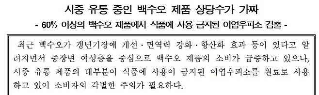 검사 결과 백수오 제품에서 중국산 유사 약초인 이엽우피소가 검출됐는데, 이엽우피소는 독성 우려 때문에 식품 원료로 쓸 수 없습니다.