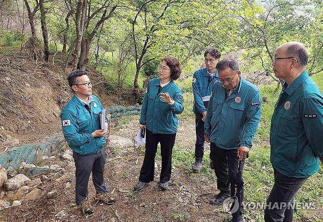 (대전=연합뉴스) 이미라 산림청 차장(왼쪽 두 번째)이 16일 울산 산불피해지 응급복구 현장을 점검하고 있다. 2025.5.16 [산림청 제공. 재판매 및 DB 금지]