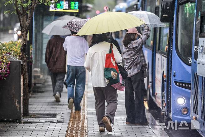 [서울=뉴시스] 정병혁 기자 = 16일 서울 종로구 광화문네거리에서 우산을 쓴 시민들이 이동하고 있다. 2025.05.16. jhope@newsis.com