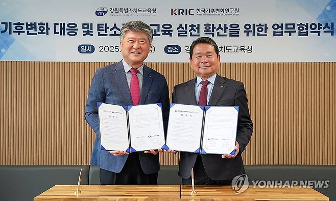 (춘천=연합뉴스) 16일 강원 춘천시 강원특별자치도교육청에서 열린 기후위기 대응과 탄소중립 교육·실천 확산 업무 협약식에서 김동일 한국기후변화연구원장(왼쪽)과 신경호 교육감이 협약서에 서명한 뒤 기념 촬영하고 있다. 2025.5.16 [강원특별자치도교육청 제공. 재판매 및 DB 금지]