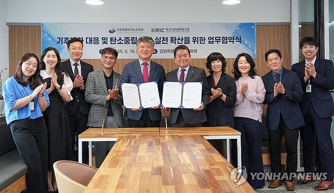 (춘천=연합뉴스) 16일 강원 춘천시 강원특별자치도교육청에서 열린 기후위기 대응과 탄소중립 교육·실천 확산 업무 협약식에서 김동일 한국기후변화연구원장과 신경호 교육감이 협약서에 서명한 뒤 참석자들과 기념 촬영하고 있다. 2025.5.16 [강원특별자치도교육청 제공. 재판매 및 DB 금지]