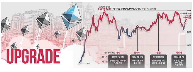 5월 들어 미·중 관세협상 등으로 코인시장에 훈풍이 부는 가운데 이더리움이 타 코인 대비 유독 높은 상승세를 기록 중이다. 코인시장이 강세를 보였던 14일 기준 이더리움 가격은 전주 대비 46.7% 올라 374만4000원대를 나타내고 있다. 비트코인이 8%, XRP와 솔라나가 약 20% 상승한 것에 비해 2~5배 높다. 이더리움이 급등한 주된 이유로는 먼저 기술적인 측면이 꼽힌다. 지난 7일 이더리움의 펙트라 업그레이드가 완료됐다. 펙트라는 비트코인과 동일한 작업증명(PoW) 기반 채굴에서 금융 시스템과 유사한 지분증명(PoS) 방식으로 합의 알고리즘을 변경하면서 이더리움 2.0 시대를 열었다고 평가받는 머지 업그레이드 이후 대대적인 변화다.