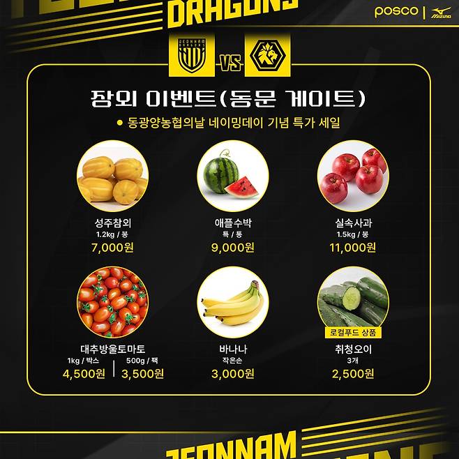 이번 경기는 동광양농협의 날 네이밍데이로 운영되며 동문게이트 광장에서 동광양농협 오픈마켓이 열린다. 성주참외, 애플수박, 사과, 대추방울토마토 등 농산물이 특가 판매될 예정이며 관중을 위한 다양한 경품 이벤트까지 마련된다. 경품으로는 광양사랑상품권(50만 원·10만 원권), 디오션 워터파크 입장권, 메가박스 영화관람권 등이 제공된다.