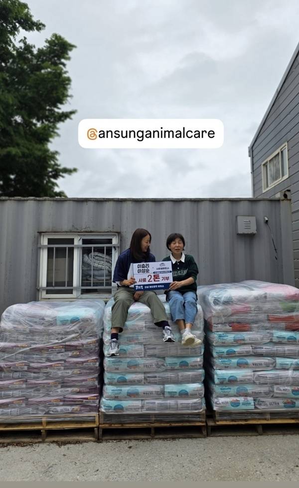 사진 속 이효리는 남편 이상순과 함께 사료 더미 위에 앉아 '이효리 이상순, 사료 2톤 기부'라고 적힌 팻말을 들고 환하게 웃고 있었다.