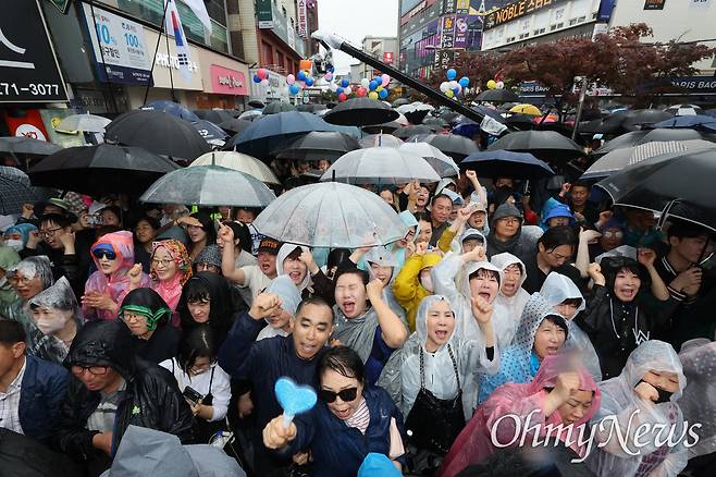 | ▲ 우비를 입은 전주 시민들이 6일 전북 전주시 전북대학교 후문에서 이재명 더불어민주당 대선 후보의 선거유세를 지켜보며 환호하고 있다. |