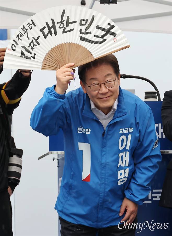 이재명 더불어민주당 대선 후보가 16일 전북 전주시 전북대 후문 앞 유세에서 '이제부터 진짜 대한민국'이라고 쓰여진 합죽선을 들어보이고 있다.