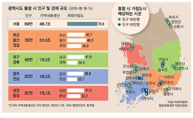 행정안전부 산하 미래지향적 행정체제개편 자문위원회(미래위)는 현재 지방행정체제가 30년 전에 만들어진 것인 만큼 광역 시도 간 통합을 통해 행정체제를 개편해야 한다고 지적했다. 통합을 권고할 수 있는 지역으로 과거엔 하나의 자치단체였다가 지금은 분리된 부산·울산·경남, 대구·경북, 광주·전남, 대전·충남이 꼽힌다. 이 같은 통합이 이뤄지면 2023년 인구 기준 서울의 35~80% 수준에 달하는 초광역 자치단체가 탄생한다. 규모의 경제를 실현할 수 있다는 이야기다. 대표적으로 부울경은 통합 인구가 765만명으로 서울(939만명)에 못지않다.