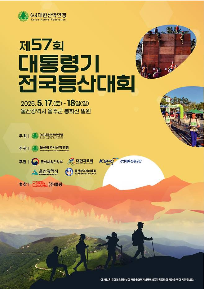 사단법인 대한산악연맹(회장 조좌진)은 "17~18일에 걸쳐 울산광역시 울주군 봉화산 일원에서 '제57회 대통령기 전국 등산대회'를 개최한다"고 16일 밝혔다.