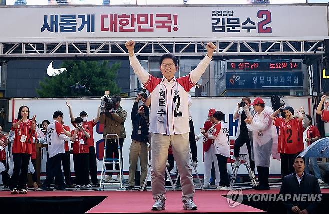 (대전=연합뉴스) 박동주 기자 = 국민의힘 김문수 대선 후보가 16일 대전 중구 으능정이거리 일대에서 유세를 하고 있다. 2025.5.16 [공동취재]