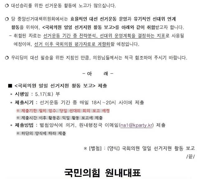 16일 한국경제신문의 취재를 종합하면 국민의힘 원내행정국은 이날 각 의원실에 '제 21대 대선 국회의원 일일 선거 지원 활동 보고' 제출을 요구하는 공문을 발송했다.