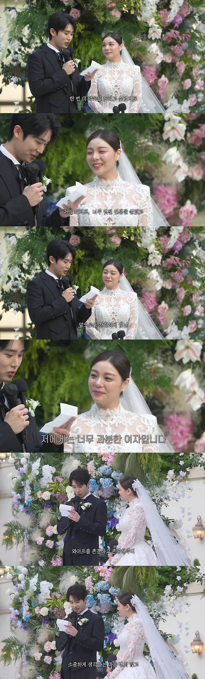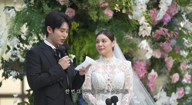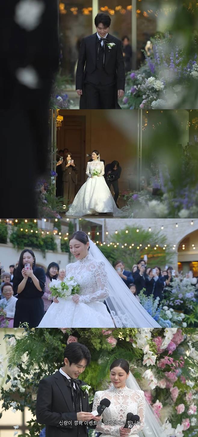 이어 신랑 최시훈의 깜짝 이벤트가 이어졌다. 양복 안주머니에서 준비한 편지를 꺼낸 그는 "제가 굉장히 내성적이어서 와이프가 여러가지 해달라고 했던 게 있었는데 아무것도 못 해줘서 너무 미안하기도 해서 작은 이벤트 준비했다"고 말문을 열었다.
