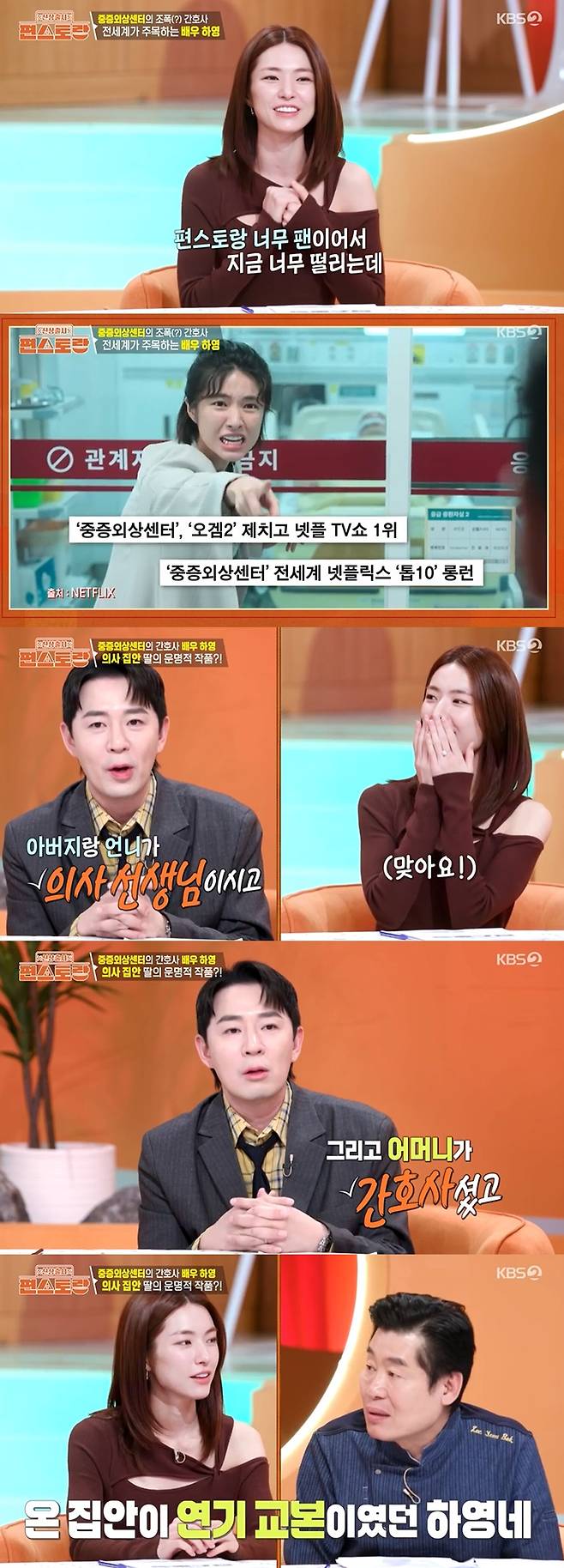 이날 '중증외상센터'에서 간호사 천장미 역을 맡아 열연을 펼쳤던 하영이 등장했다. 붐은 "작품에서 간호사 디테일을 잘 살렸다. 따로 조사를 해보니까 아버지랑 언니가 실제로 의사 선생님이고, 어머니는 간호사셨다"고 밝혔다.