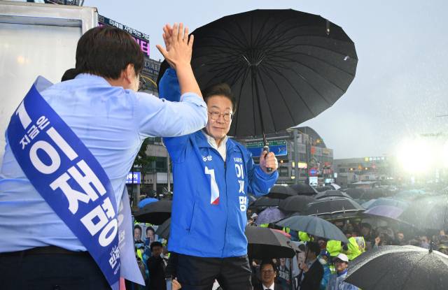 이재명 더불어민주당 대선 후보가 16일 전북 정읍시 정읍역 광장에 도착해 모경종 의원과 인사하고 있다. 정읍=오승현 기자 2025.05.16