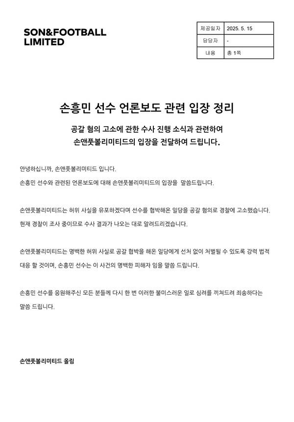 앞서 손흥민의 소속사 ‘손앤풋볼리미티드’는 15일 공식 홈페이지를 통해 입장문을 발표했다. 소속사는 “허위 사실을 유포하겠다며 선수를 협박해온 일당을 공갈 혐의로 경찰에 고소했다. 현재 경찰이 조사 중이며, 수사 결과가 나오는 대로 알리겠다”라고 전했다.