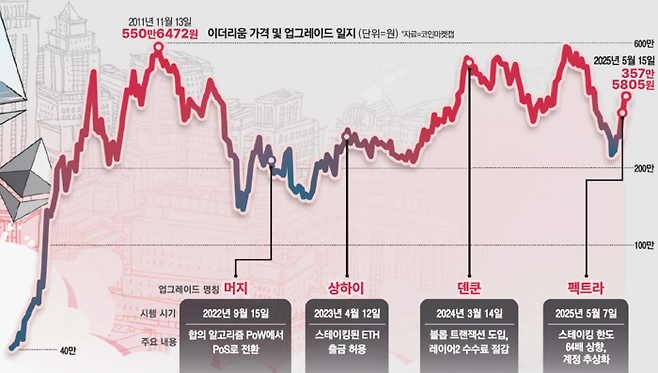 지난 7일 이더리움의 펙트라 업그레이드가 완료됐다. 펙트라는 비트코인과 동일한 작업증명(PoW) 기반 채굴에서 금융 시스템과 유사한 지분증명(PoS) 방식으로 합의 알고리즘을 변경하면서 이더리움 2.0 시대를 열었다고 평가받는 머지 업그레이드 이후 4년 만의 대대적인 변화다.