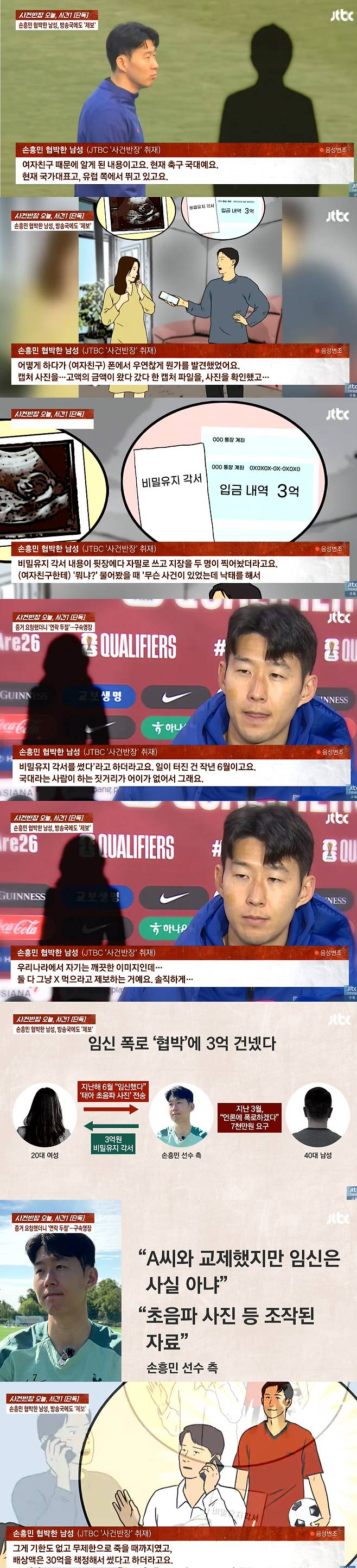 손흥민 측에 확인 결과 임신으로 협박한 여성은 20대의 모델업계 종사자이며 해당 여성과 교제 사실은 인정했다. 지난해 6월 임신 소식을 알려서 만나서 이야기하자고 했는데 돈을 달라고 해서 3억을 입금한 것이라는 것. 이후 40대 남성이 손흥민 에이전시에게 연락해 비밀유지 각서의 조건을 변경해 달라고 집요하게 요구해왔다고 했다. 계속된 거절에도 협박 강도가 세지자 에이전시가 손흥민에게 해당 내용을 공유하고 손흥민이 고소를 결심했다.
