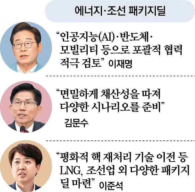 김 후보는 미국과의 협상 시 조선업 협력이나 액화천연가스(LNG) 등을 하나로 묶은 패키지 딜에 대해 “패키지 안에서 미국이 원하는 것과 우리가 얻을 수 있는 것이 공존하는 구조”라며 “유리한 딜이 될 수 있게 면밀하게 채산성을 따지고 다양한 시나리오를 준비해야 한다”고 밝혔다.