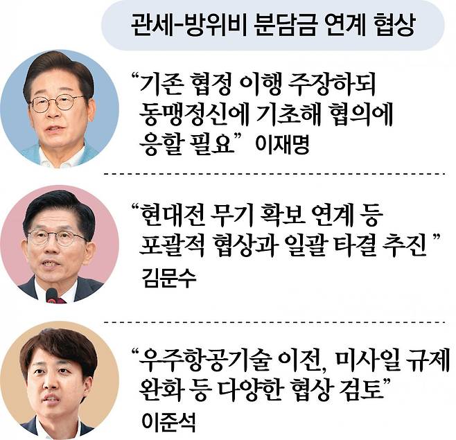방위비 협상 연계 가능성에 대해 김 후보는 “한미동맹 차원에서 포괄적 협상과 일괄 타결을 추진하겠다. 현대전 무기 수요와 연계해 협상하면 윈윈이 가능하다”고 했다.