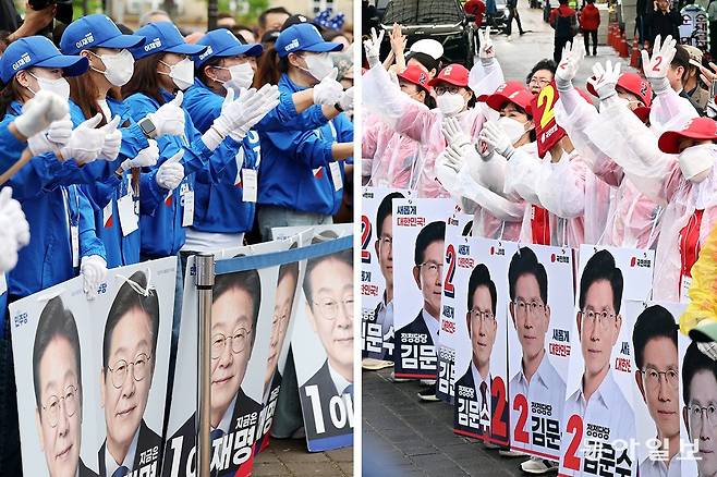 | “우리 후보 뽑아주세요” 6·3 대선 공식 선거운동 기간 첫 주말을 앞둔 16일 더불어민주당 이재명 후보와 국민의힘 김문수 후보 선거운동원들이 치열한 유세전을 벌였다. 전북 군산시 구시청광장에서 이 후보 선거운동원들이 율동을 하는 모습. 오른쪽은 같은 날 경기 수원시 지동시장에서 김 후보 선거운동원들이 지지를 호소하는 모습이다. 군산=뉴시스·수원=장승윤 기자 tomato99@donga.com |