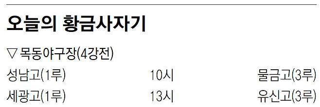 한편 16일 목동야구장에서 열릴 예정이었던 성남고와 물금고, 세광고와 유신고의 황금사자기 준결승은 우천으로 하루 순연됐다. 1경기는 성남고가 물금고에 1-0으로 앞선 1회초 1사 3루에서 재개된다.