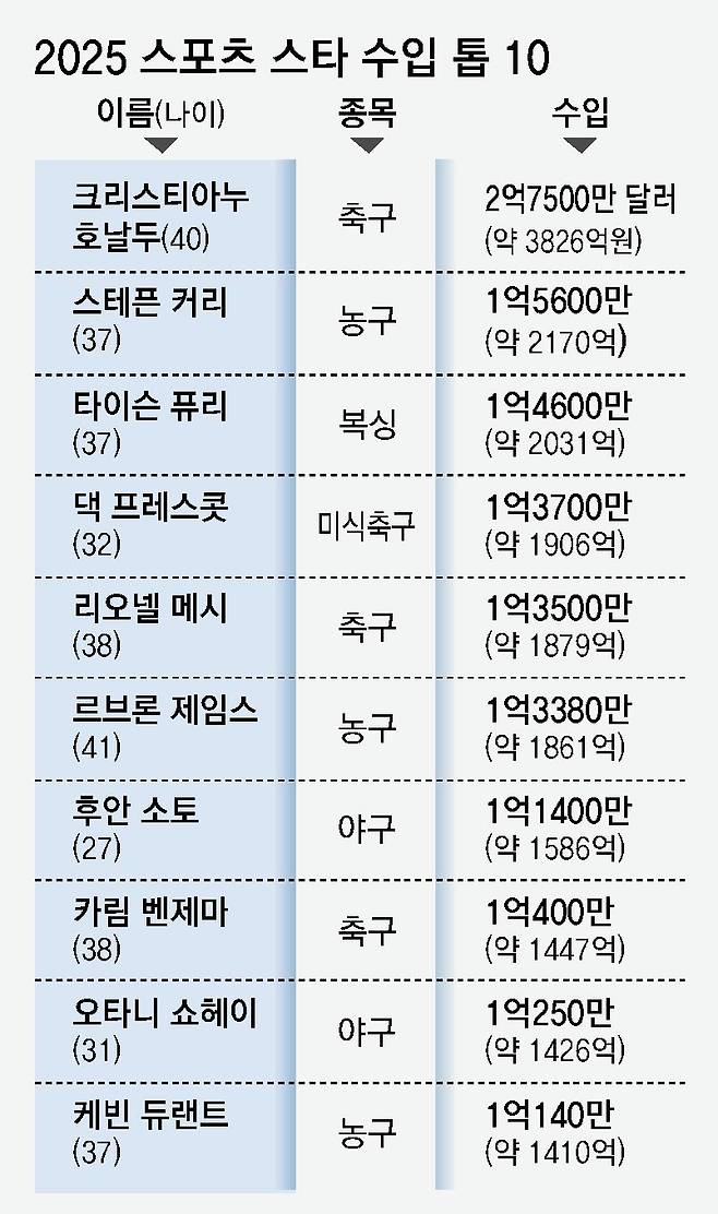 미국 경제전문지 포브스는 16일 “호날두는 지난 12개월 동안 2억7500만 달러(약 3826억 원)를 벌어 전 세계 스포츠 선수 중 소득 1위를 차지했다”고 전했다. 한국 돈으로 하루 평균 10억5000만 원, 시간당으로는 4400만 원을 벌었다. 호날두는 이 집계에서 3년 연속이자 통산 5번째 1위에 올랐다.