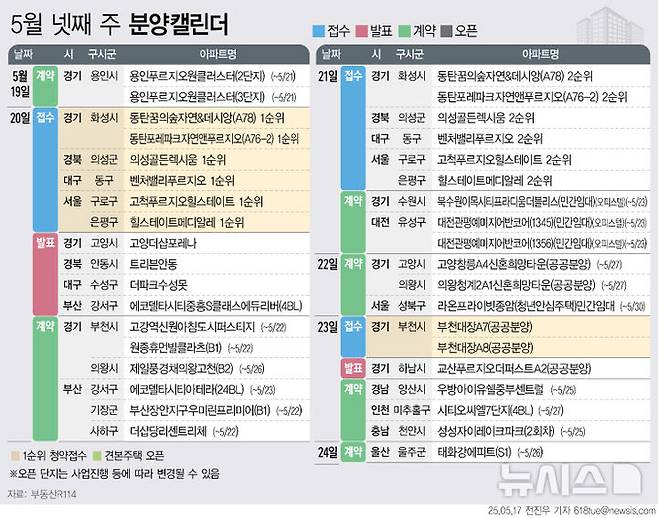 [서울=뉴시스] 부동산R114는 5월 넷째 주 전국 8개 단지 총 7623가구가 분양에 나선다고 17일 밝혔다. 이중 일반분양은 4575가구 규모다. (그래픽=전진우 기자)