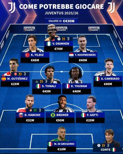 먼저 유벤투스의 경우, 이 매체는 백3로 구성된 수비진에 팀의 기존 수비진인 브라질 출신 브레메르를 중심으로 가티와 더불어 새로운 수비수로 네덜란드 출신 수비수 다비드 한츠코(페예노르트)를 배치했다.