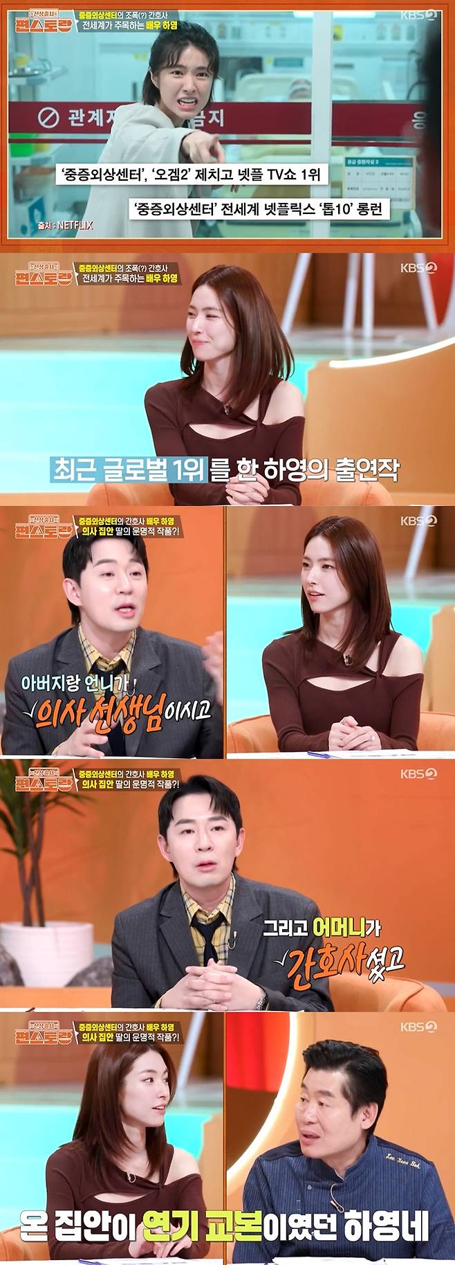 이날 '중증외상센터'에서 간호사 천장미 역을 맡아 열연을 펼쳤던 하영이 등장했다. 붐은 "작품에서 간호사 디테일을 잘 살렸다. 따로 조사를 해보니까 아버지랑 언니가 실제로 의사 선생님이고, 어머니는 간호사셨다"고 밝혔다.