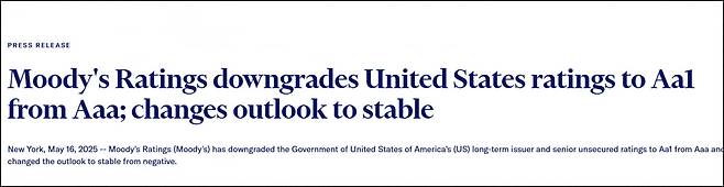 무디스는 16일 오후 보도자료를 내고 미국의 신용등급을 기존 Aaa 등급에서 Aa1으로 한 단계 떨어뜨렸다. 무디스는 "의회가 현재 추진 중인 예산안이 지출과 적자를 다년간 실질적으로 감축할 것이라고는 생각하지 않는다"라며 "미국의 재정 상황은 과거 대비, 그리고 다른 높은 신용등급 국가들과 비교했을 때에도 악화할 가능성이 크다"라고 이유를 밝혔다. 무디스는 세계 3대 신용평가사 가운데 미국 정부에 최고 신용등급을 부여하고 있는 유일한 곳인데, 지난해 11월 신용등급 전망을 부정적으로 낮춘 바 있다.