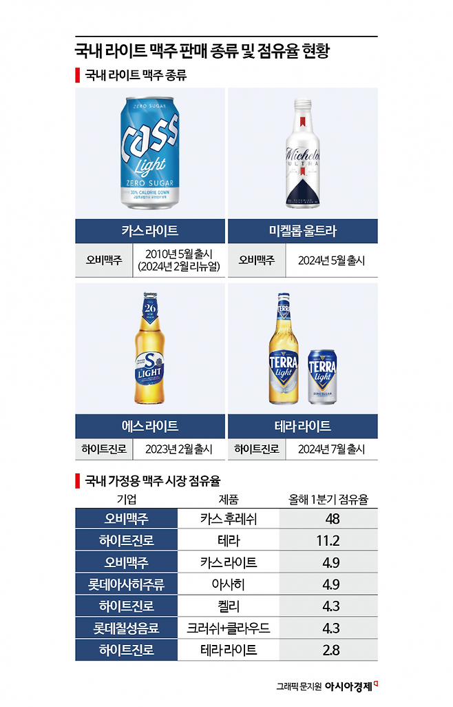 국내에서 라이트 맥주 시장에 가장 먼저 뛰어든 것은 오비맥주다. 오비맥주는 2010년 '카스 라이트'를 출시했다. '카스 후레쉬'보다 도수는 0.5도 낮은 4도이고 칼로리도 500㎖ 기준 125㎉로 카스 후레쉬보다 65㎉ 낮은 것이 특징이다. 라이트 맥주가 많지 않던 시기에 1위 맥주 '카스 프레시'의 자매 브랜드로서 인지도를 높여왔다. 카스 라이트는 2023년 점유율 기준 8위에서 지난해 6위로 올라섰고 올해엔 경쟁사 메이저 브랜드인 '켈리'와 '크러시'까지 넘어섰다. 지난해엔 미국의 '미켈롭 울트라'를 국내에 선보이며 라이트 맥주 경쟁력을 강화하기도 했다. 골프장에 우선 유통되는 미켈롭 울트라는 알코올 도수 4.2%로, 당류를 포함하지 않았다.