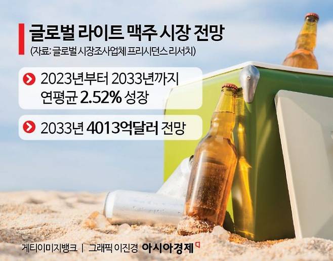 해외 맥주 시장은 이미 라이트 맥주가 인기를 끌고 있다. 올해 북미 맥주 시장 상위 10개 브랜드 중 6개가 버드 라이트, 미켈롭 울트라, 쿠어스 라이트, 밀러 라이트 등 라이트 맥주 제품이다. 일본 역시 라이트 맥주가 보편적으로 팔리고 있다. 라이트 맥주 시장의 전망도 밝다. 프리시던스 리서치에 따르면 2033년 라이트 맥주 시장 규모는 2023년 대비 28% 성장한 4013억달러(약 550조원)로 예상된다.
