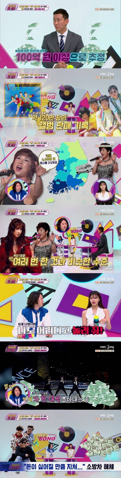 지난 5월 16일 밤 8시 30분 방송된 KBS Joy ‘이십세기 힛-트쏭’ 265회에서는 ‘돈 냄새 폴폴~ “억!” 소리 나는 힛-트쏭’이라는 주제로, 수익이 어마어마한 메가 히트곡들을 소개했다.