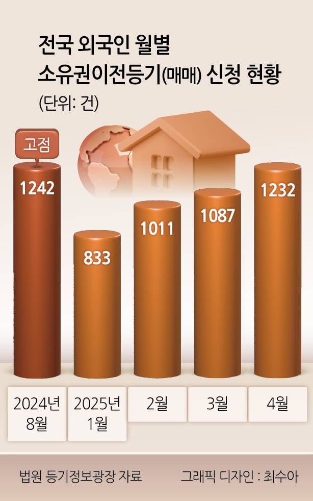 아파트 등 공동주택으로 구성된 집합건물로 좁혀서 살펴보더라도 증가세는 뚜렷하다. 지난달 외국인이 신청한 집합건물에 대한 매수 등기는 총 1232건으로, 1242건을 기록한 지난해 8월 이후 최대였다. 특히 올해는 1월 833건→2월 1011건→3월 1087건→4월 1232건으로 우상향 중이다.