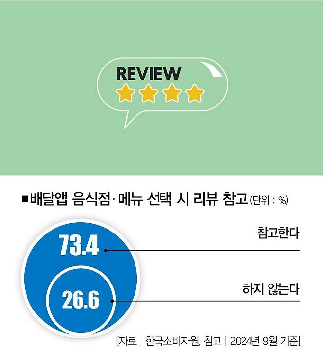 어떠신가요? 지훈씨와 같은 경험을 해본 적 없으신가요? 후기 하나, 별점 하나가 업소의 운명을 좌우하는 시대입니다. 특히 배달앱에서 소비자가 남긴 리뷰는 무시 못할 영향력을 지닙니다. 한국소비자원이 2024년 9월 실시한 설문조사에 따르면, 배달앱에서 음식점·메뉴를 선택할 때 리뷰를 참고하냐는 질문에 73.4%가 '많이 참고한다'고 답했습니다.