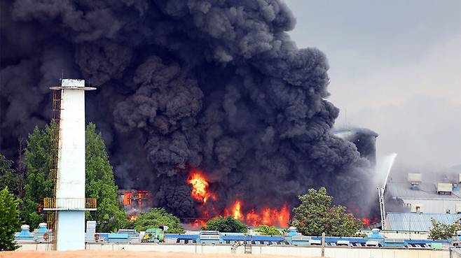 ▲ 17일 오전 광주 광산구 송정동 금호타이어 광주공장에서 불이 나 검은 연기가 치솟고 있다.