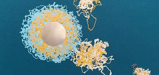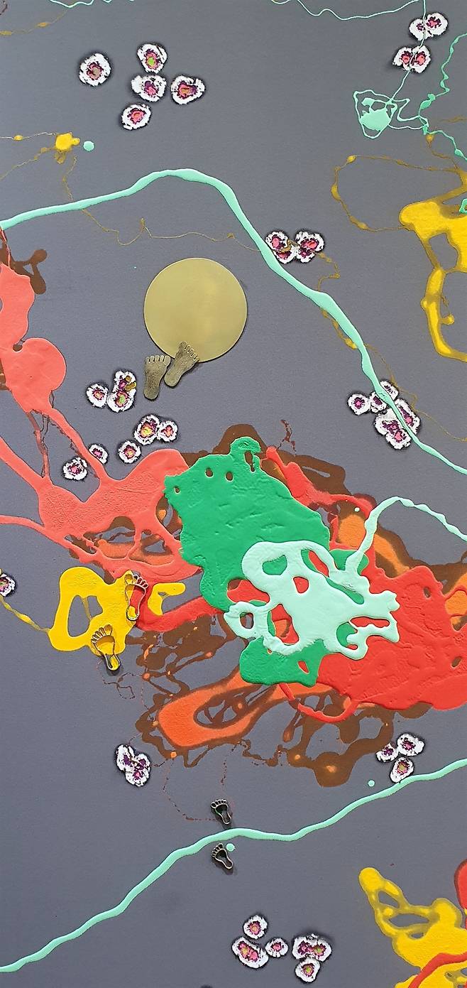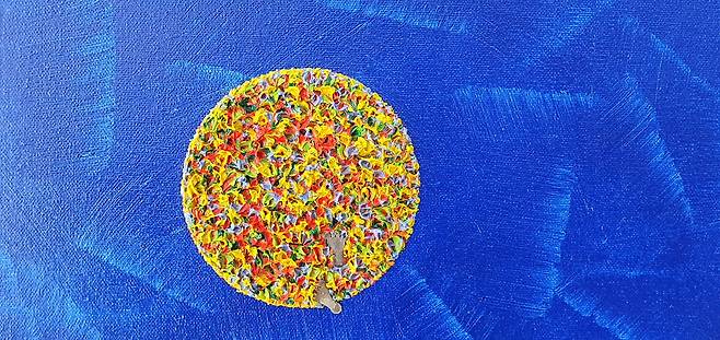 이 작가는 "금속으로 구현된 발자국은 도달의 의지를 말하며 아직 도달하지 않는 세계를 향한 나, 스스로의 선언이다. 태양의 상징성은 자신이 발 딛고 선 자리 그 너머에 그리는 사유(思惟)와 이상향, 색은 감정의 에너지인 내면의 끓어오르는 '나'를 드러낸다"라고 했다.