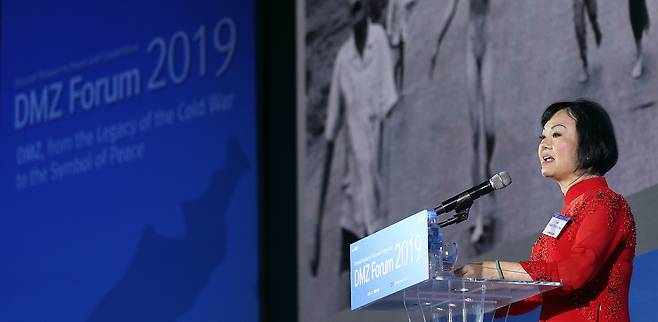 | ▲ 판티 킴푹(PHAN THI Kim Phuc) 여사가 2019년 9월 19일 오전 킨텍스 제1전시관 3층 그랜드볼룸홀에서 열린 ‘DMZ 포럼 2019 개회식’에서 기조연설을 하고 있다. |