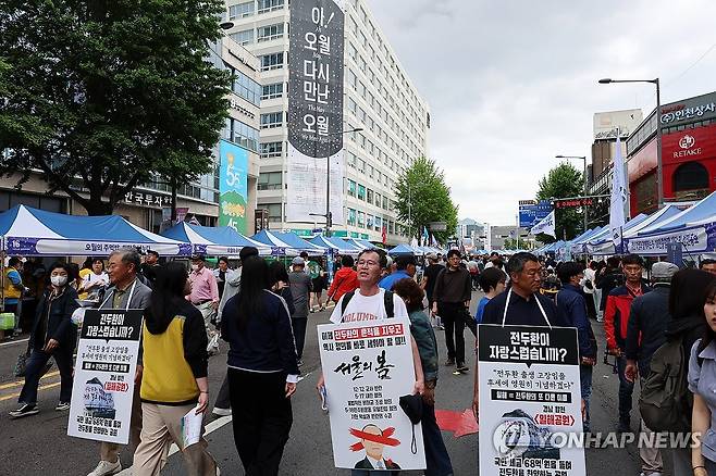 (광주=연합뉴스) 조남수 기자 = 17일 오후 광주 동구 금남로에서 열린 제45주년 5·18민주화운동 전야제에서 합천군민들이 일해공원 폐지 서명운동을 하고 있다. 2025.5.17