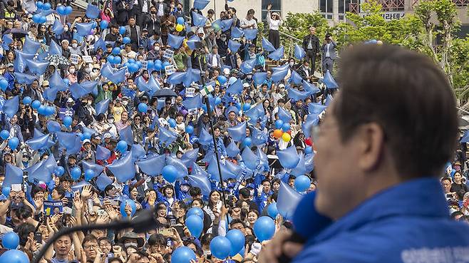 ▲ 더불어민주당 이재명 대선 후보가 17일 광주광역시 서구 김대중컨벤션센터 광장에서 열린 집중 유세에서 지지를 호소하는 연설을 하고 있다.