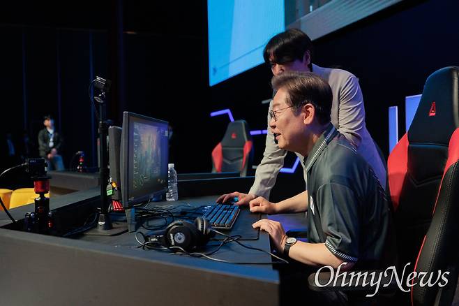| ▲ 이재명 더불어민주당 대선후보가 17일 오후 광주광역시 조선대 이스포츠경기장에서 열린 이스포츠 산업 현장 간담회에서 박정석 OK저축은행 브리온 이스포츠 단장·전 스타크래프트 프로게이머의 도움을 받아 게임 체험을 하고 있다. |