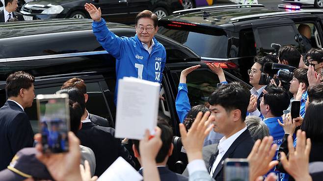 ▲ 더불어민주당 이재명 대선 후보가 17일 광주광역시 서구 김대중컨벤션센터 광장에서 열린 집중 유세에서 연설을 마친 뒤 떠나고 있다.
